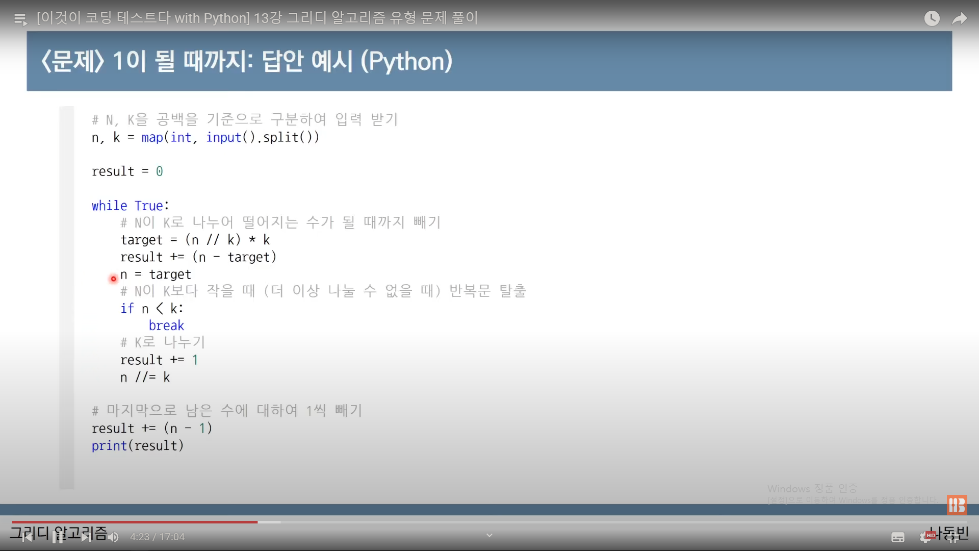 - 그리디 알고리즘.(n을 k로 나누거나, n을 1로빼는 연산만 가능할때 n이 1이 되는 최소 연산횟수.)